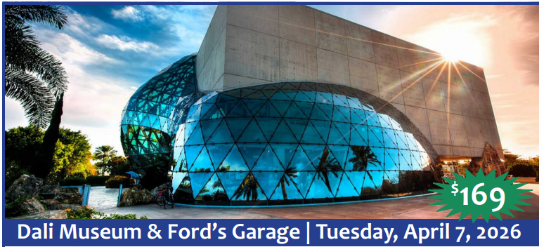 Visit an unparalleled collection of works by renowned artist Salvador Dalí, from iconic melting clocks to imaginative visual illusions and avant-garde symbols. Shop, play, wander, and quench your curiosity for all that is Salvador Dalí and beyond. Step into the mesmerizing world of Salvador Dalí as art comes to life like never before. The Dalí Museum’s Dalí Alive 360° is an immersive experience celebrating the life and creative genius of one of the most influential and inventive artists of the modern era. This multi-sensory art experience envelops visitors in 360 degrees of light and sound within a monumental new Museum space: The Dalí Dome. Before departing for home, we will make a stop at the Ford Garage to enjoy lunch.