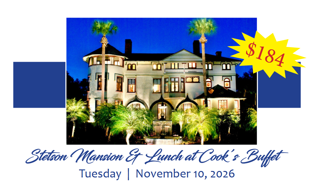 Trip Advisor names a tour of the Stetson Mansion as one of the “top 10 things to do in Florida.” The 1886 Stetson Mansion is the largest and most spectacular “Gilded Age” residence ever built in Florida before 1900. The Victorians started our modern day traditions like gift giving and Christmas trees, so what’s better than seeing where it all started? The Stetson Mansion had one of the first trees ever illuminated with electric lights. That’s what you get when Thomas Edison is your bff! The Stetson Mansion is Florida’s most historic home, but it is not a museum. It is a private residence that is lived in and welcomes guests this time of year with over the top elegant and reverent adult holiday decorations. Prior to our tour we will have lunch at Cook’s buffet.